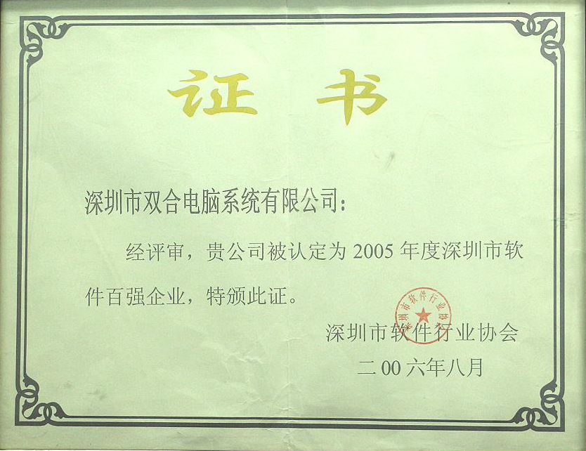 2005 Shenzhen Top 100 Software Enterprise certificate